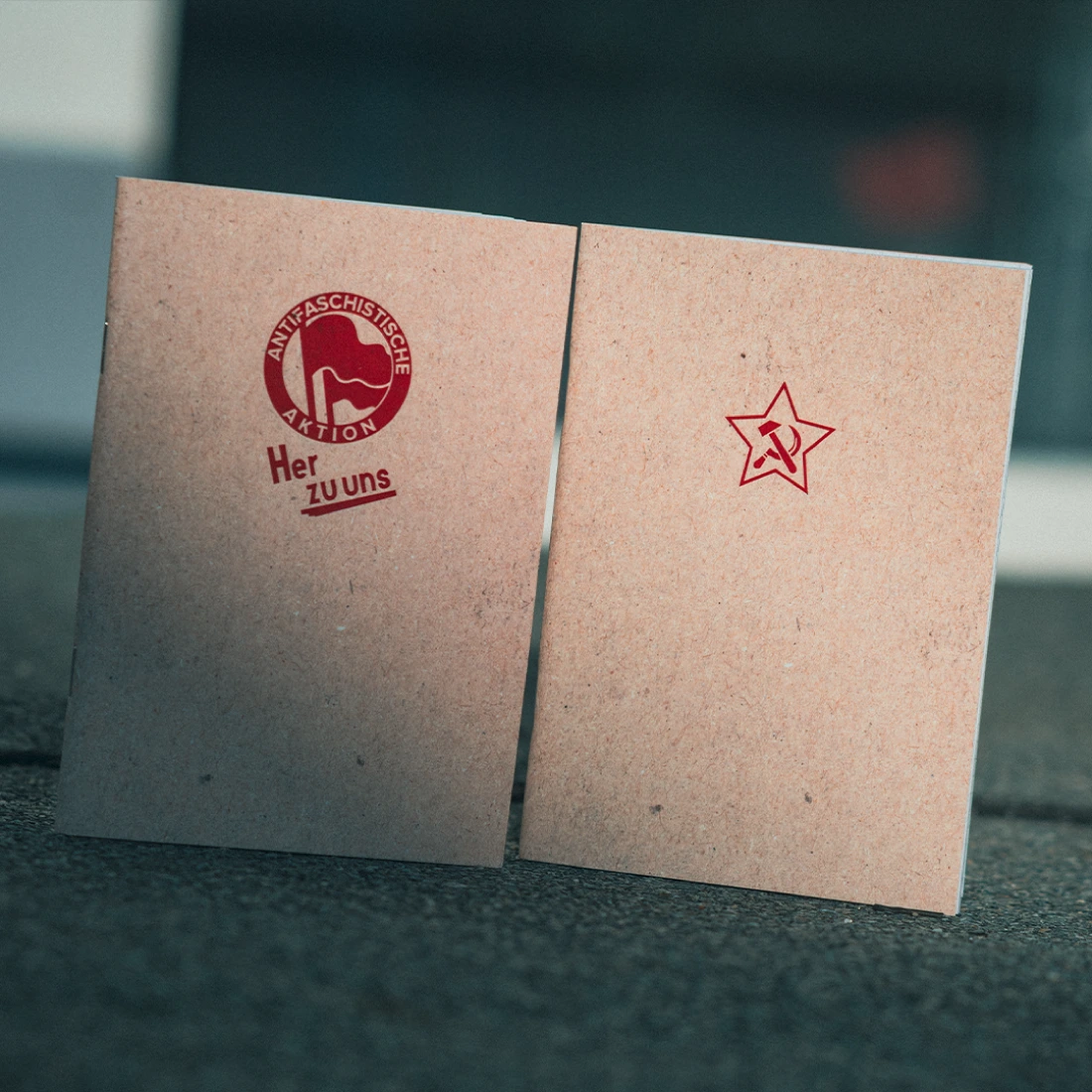 Hammer Sichel Print auf der Vorderseite mit partiellem UV-Lack veredelt.