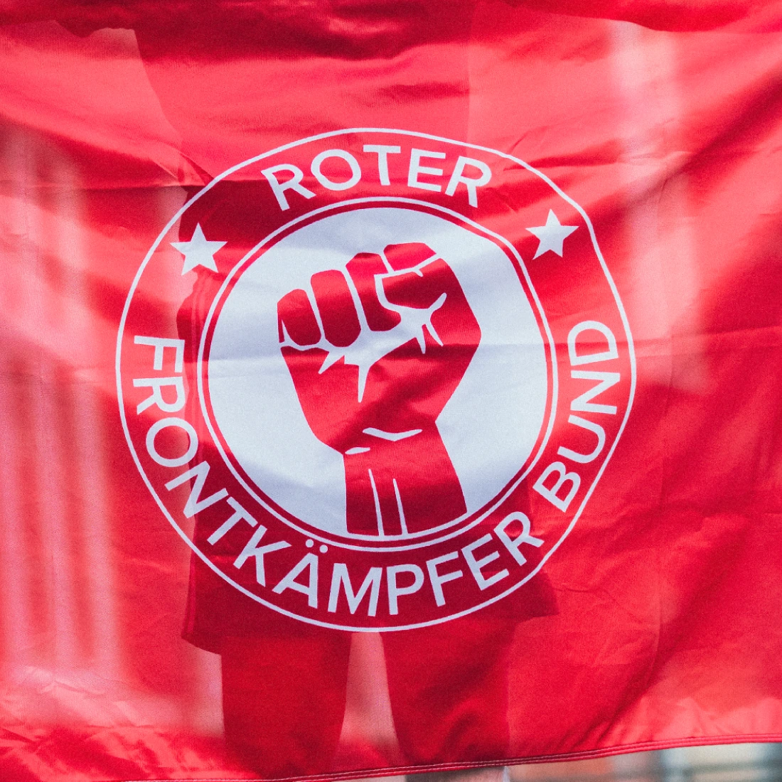 Fahne mit dem Logo des roten Frontkämpferbundes.